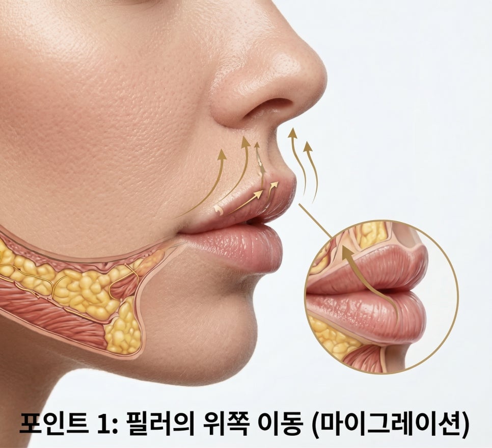 입술 조직은 담을 수 있는 용량이 한정적이라, 과하게 주입하면 필러가 경계를 넘어 인중 쪽으로 타고 올라가는 필러 이동 현상이 생기거든요.