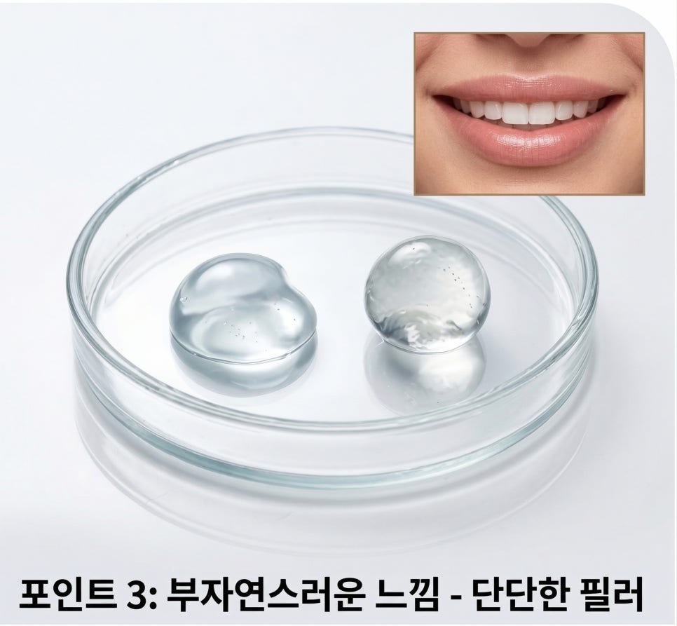 👉 너무 단단한 필러를 사용하면 입술이 뭉치거나, 표정을 지을 때 이물감이 도드라져 보일 수 있어요.
