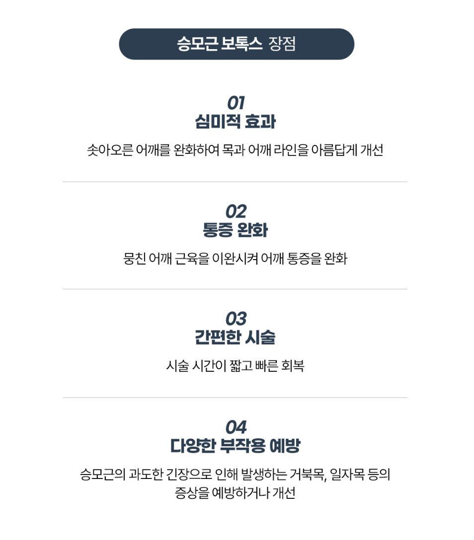 승모근보톡스는 단순히 "어깨 높이를 낮추는 시술"이 아닙니다.
