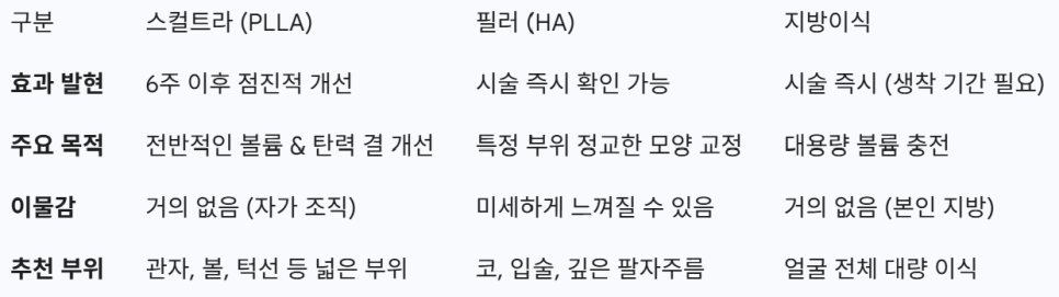 얼굴의 꺼짐 정도, 피부 두께, 원하는 변화 속도에 따라 단독이 좋을 수도 있고, 필러와 병행하는 전략이 더 합리적일 수도 있습니다.