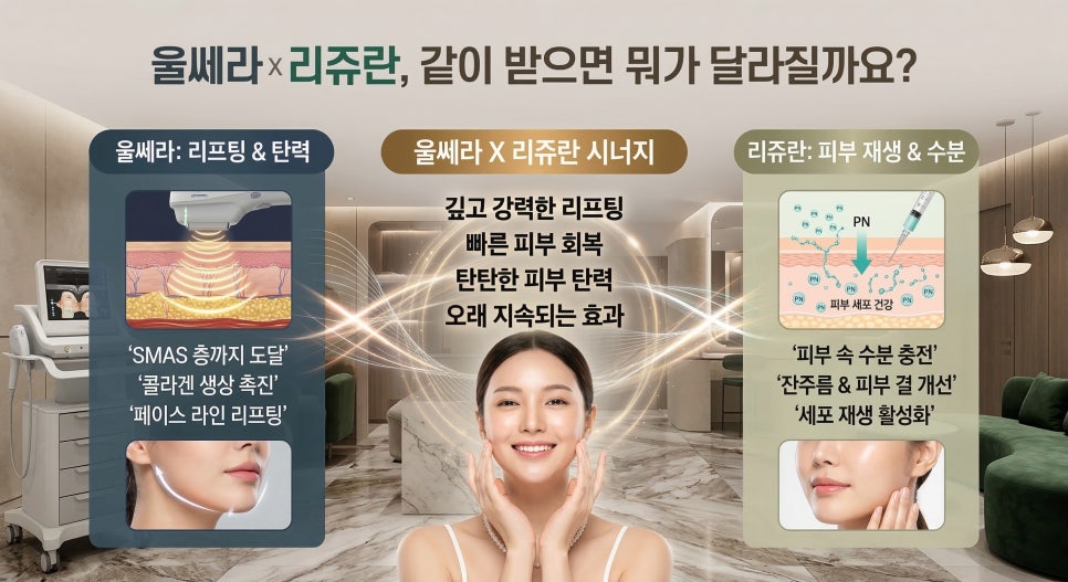 오늘은 리프팅의 기둥이라 불리는 울쎼라와 피부 재생의 핵심인 리쥬란, 이 두 시술을 함께 받을 때 알아야 할 핵심 원리와 주의 사항을 전문의 시각에서 솔직하게 풀어드릴게요.