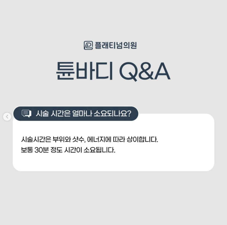 별도의 마취가 필요 없을 정도로 자극이 적고, 시술 시간도 부위별로 약 20분 내외로 매우 짧습니다.